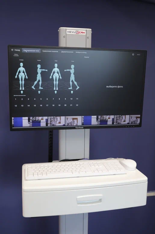 Программно-аппаратный комплекс совмещает автоматическое тотальное картирование тела c 50-мегапиксельными снимками в RAW формате (оцифрованные данные) и поляризацией, цифровую последовательную дерматоскопическую визуализацию и искусственный интеллект для ранней диагностики ЗНО кожи.